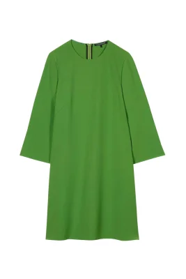 Ausgestelltes Minikleid aus stretchiger Techno-Crêpe-Seide mit Rundhalsausschnitt und Abnähern auf der Brust. Auf dem Rücken befindet sich ein Reißverschluss mit langem Zippbändchen.