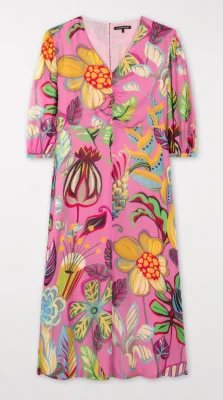 Lang geschnittenes Kleid mit V-Neck, Drapierungen an der Taille, sommerlich ausgestelltem 3/4-Arm und schwingendem Rockteil auf feinem ViskosecrĂŞpe mit farbenfrohem, karibisch-floralem Muster.