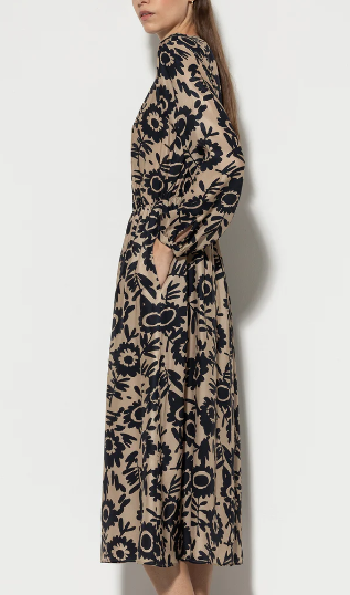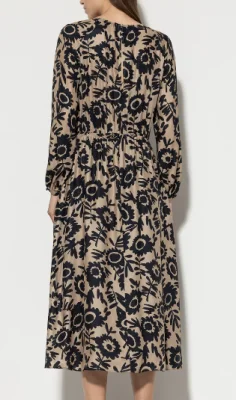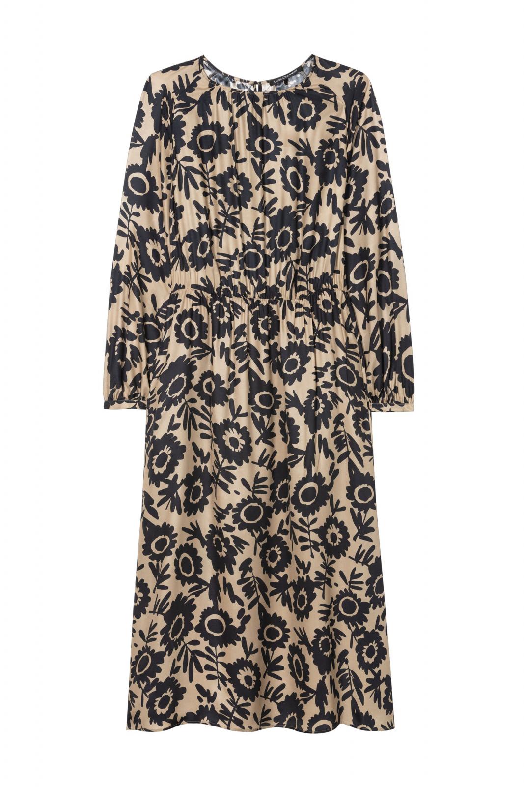 Langes Kleid aus fließender, blickdichter Seide mit exklusivem Blumen-Dessin, Gummizug in der Taille und zwei Taschen. Der Rundhalsausschnitt ist leicht angekraust und die legeren Raglanärmel schließen mit einer Ein-Knopf-Manschette ab.