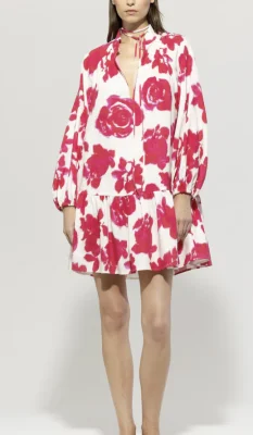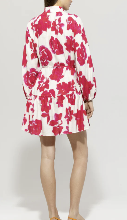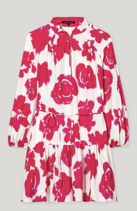 Feminines Kleid aus weicher Leinen-Viskose-Mischung mit exklusivem, abstrahiertem Blumen-Dessin. Die voluminösen Raglanärmel schließen mit einem Gummizug ab. Das Minikleid mit schwingender Silhouette hat einen Stehkragen mit Knopfverschluss, einen schmalen Bindegürtel und einen breiten Saumvolant.