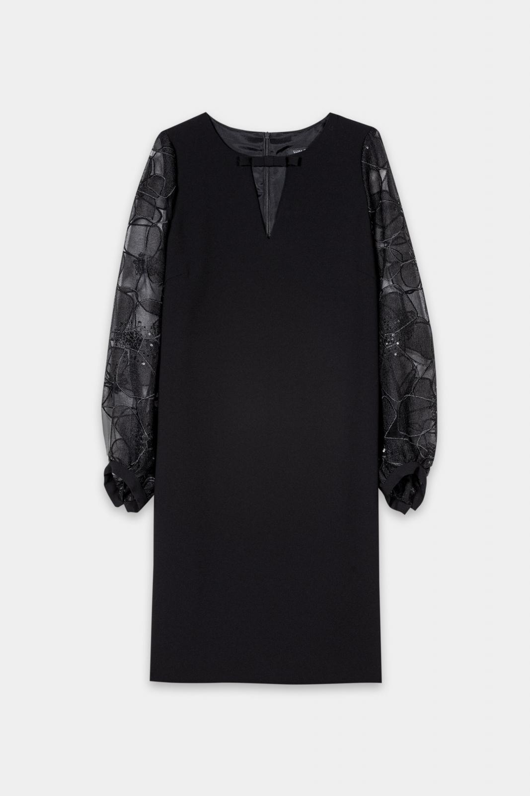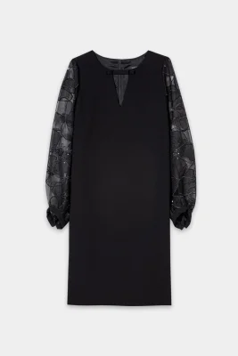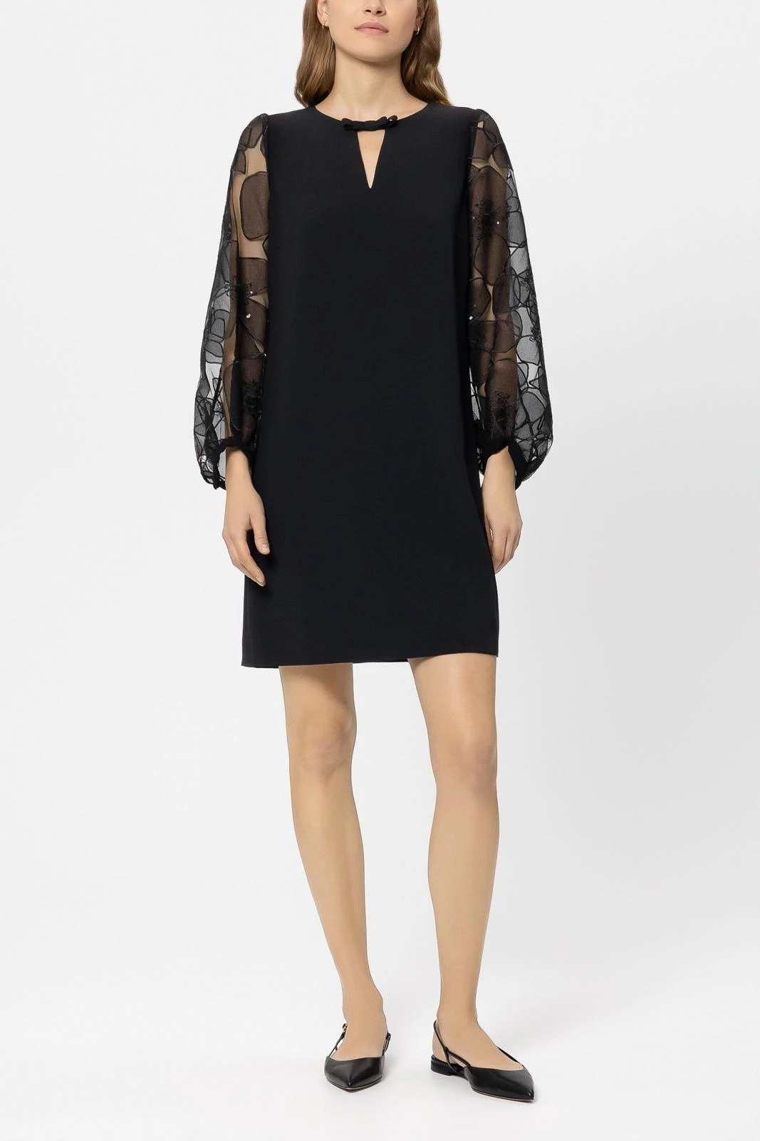 Elegantes Kleid mit V-Ausschnitt und transparenten Ärmeln im Blütenmuster.