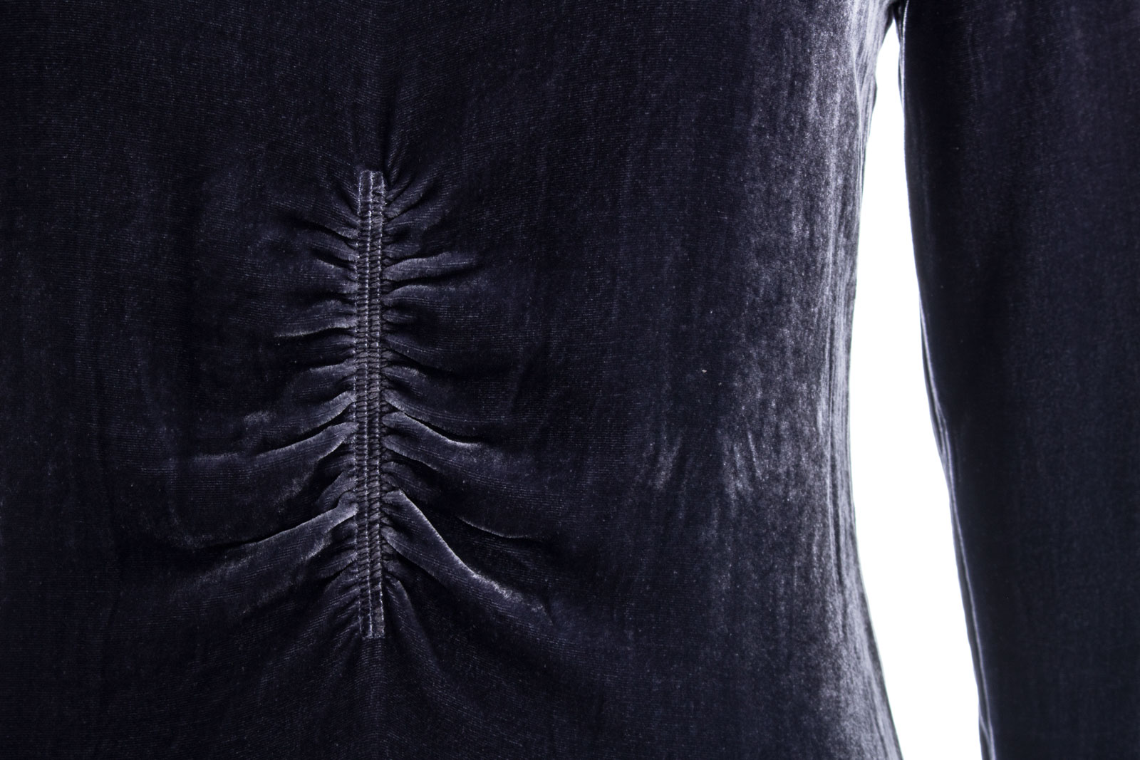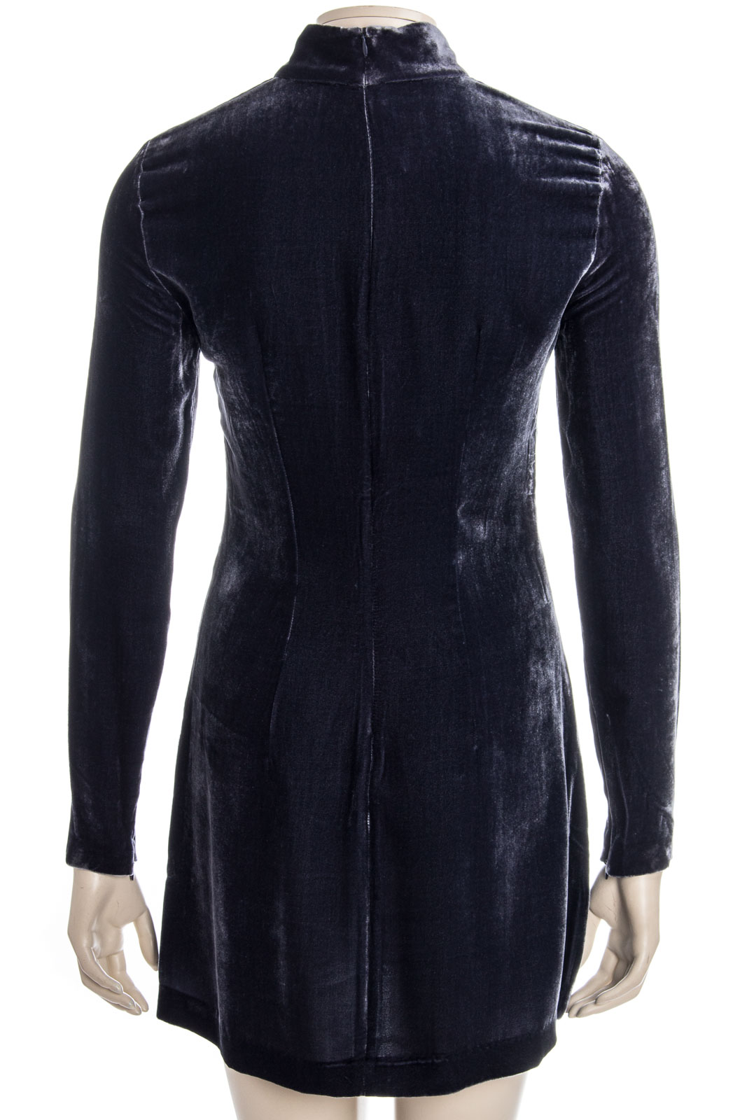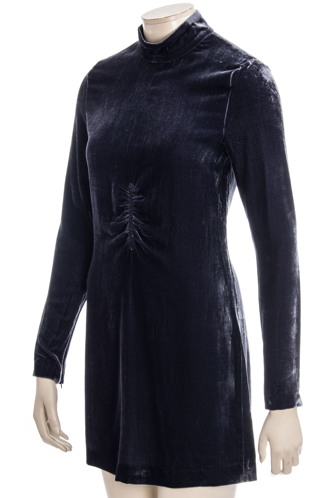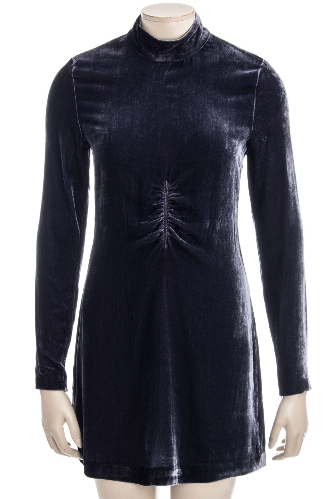 Kurzes Samtkleid mit kleinem Stehkragen und zarten Raffungen am Bauch.