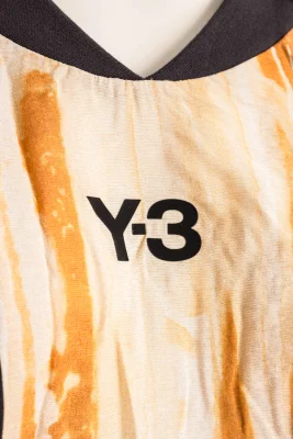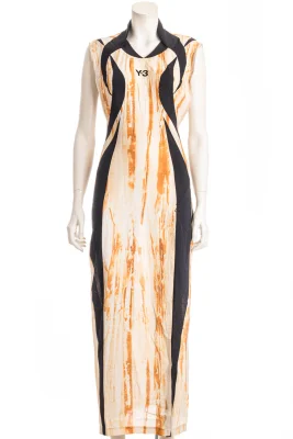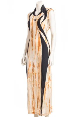 Langes Y-3 Kleid mit saisonalem Print, Logo am Ausschnitt und seitlichem langen Schlitz.