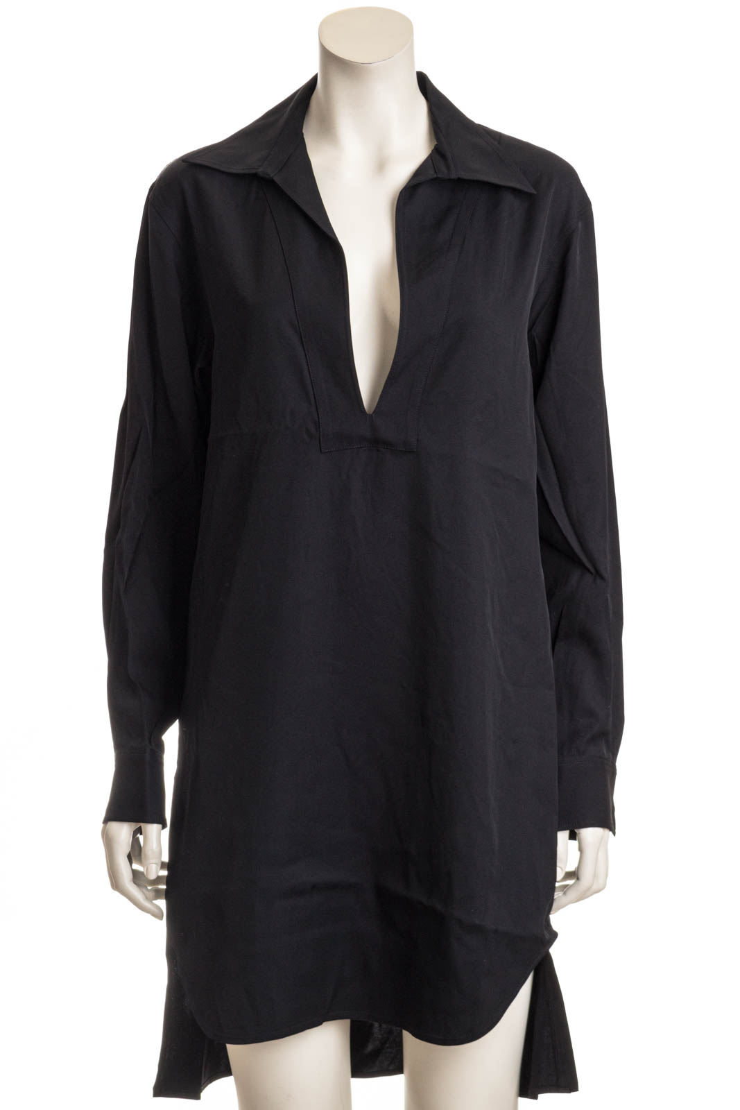 Gerade geschnittenes Kleid mit tiefen Ausschnitt, Hemdkragen und seitlichem ReiĂźverschluĂź.