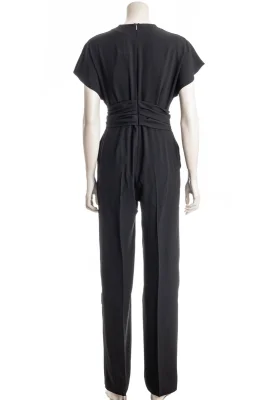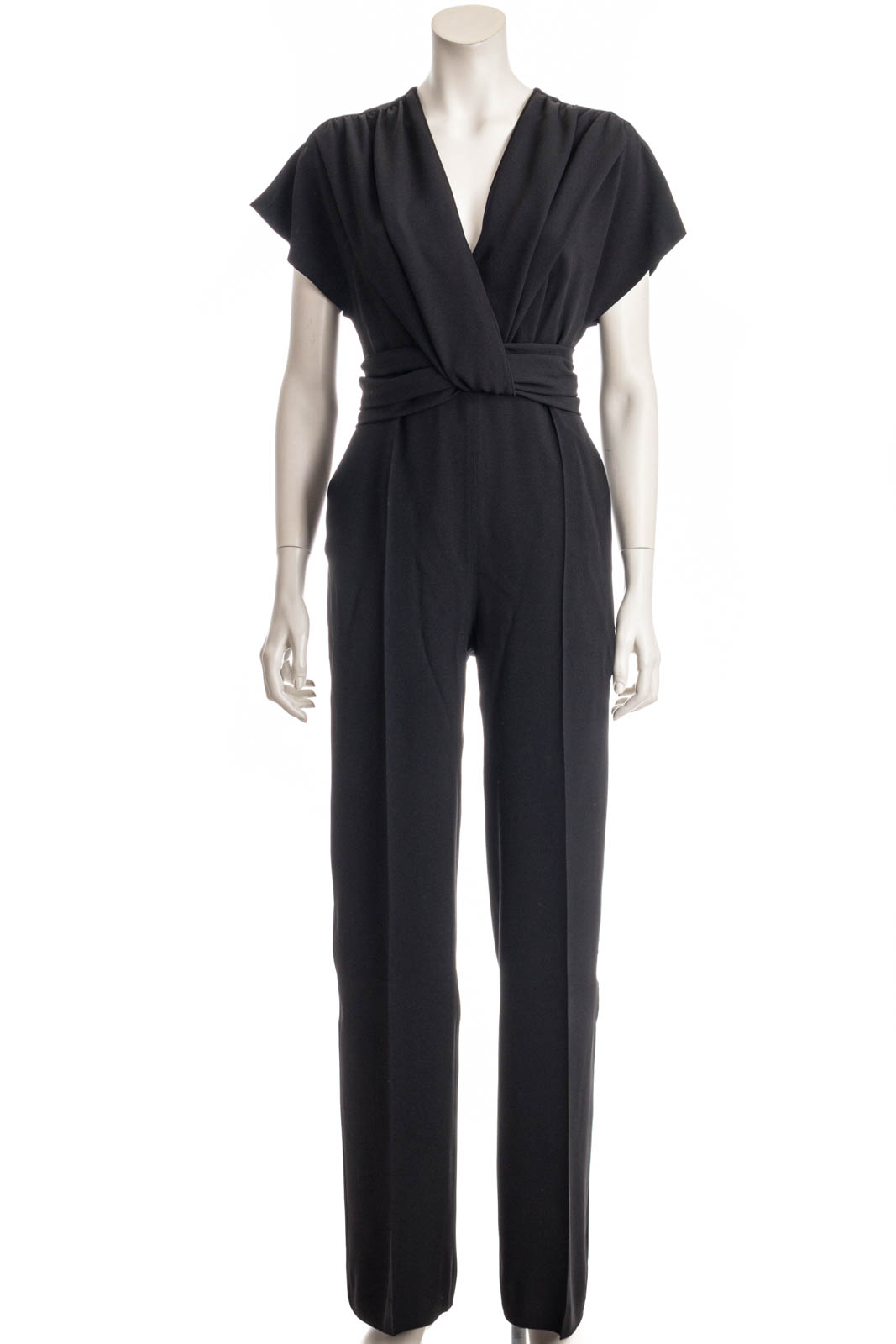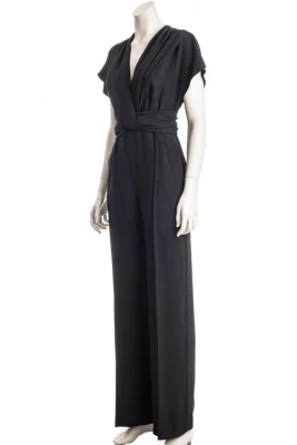 Schmal geschnittener BOSS Damen-Jumpsuit aus einem matten Gewebe mit V-Ausschnitt und Wickeleffekt auf der Vorderseite.