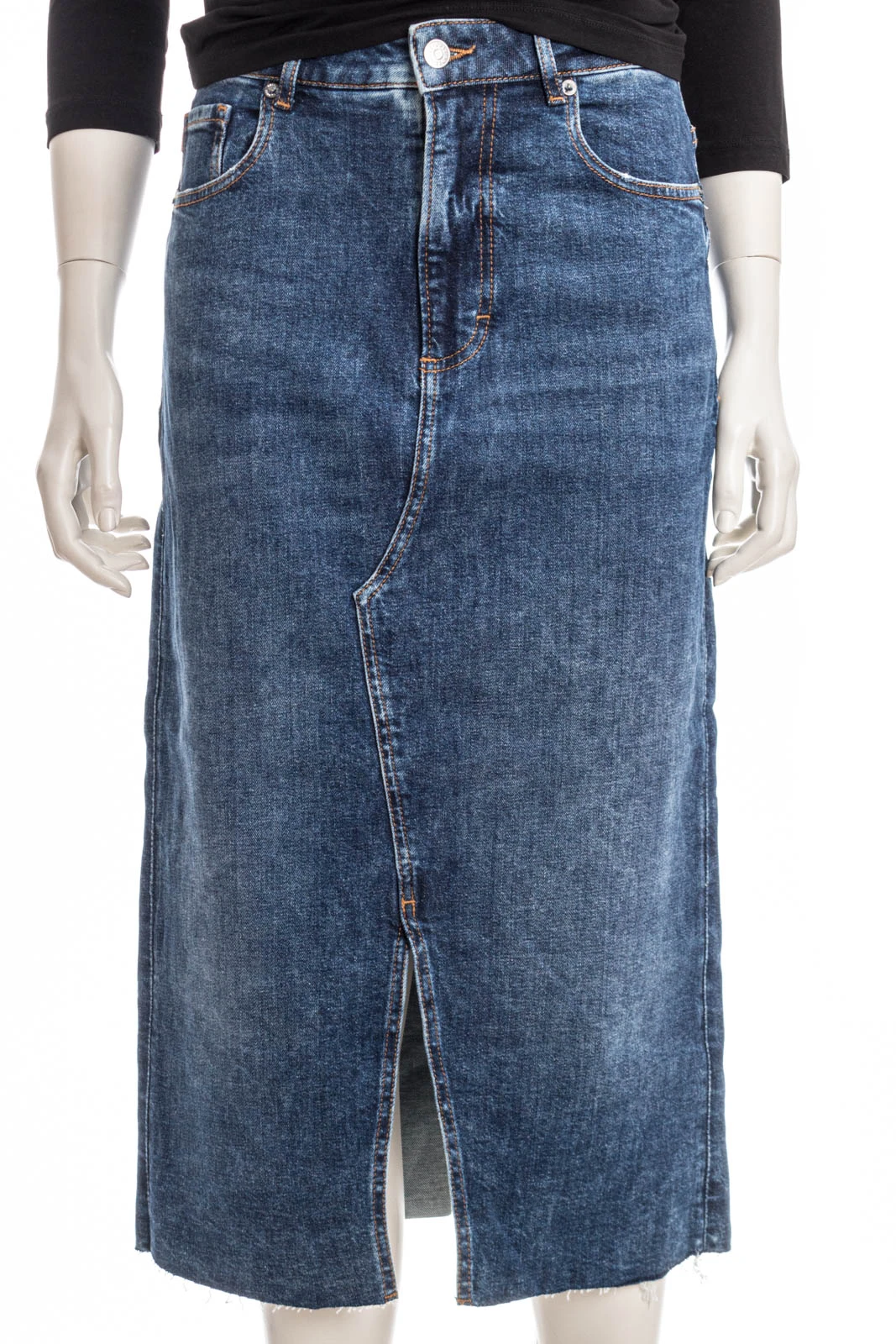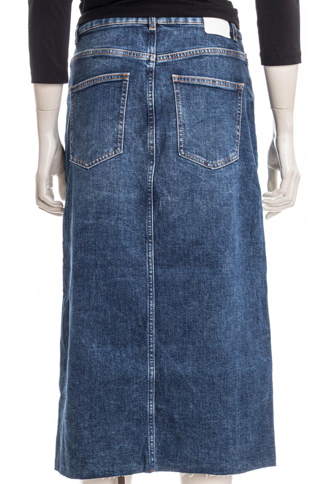 Authentischer BOSS Midirock aus Stretch-Denim mit hohem Bund, schmaler Passform, Signature-Details und Schlitz auf der Vorderseite.