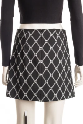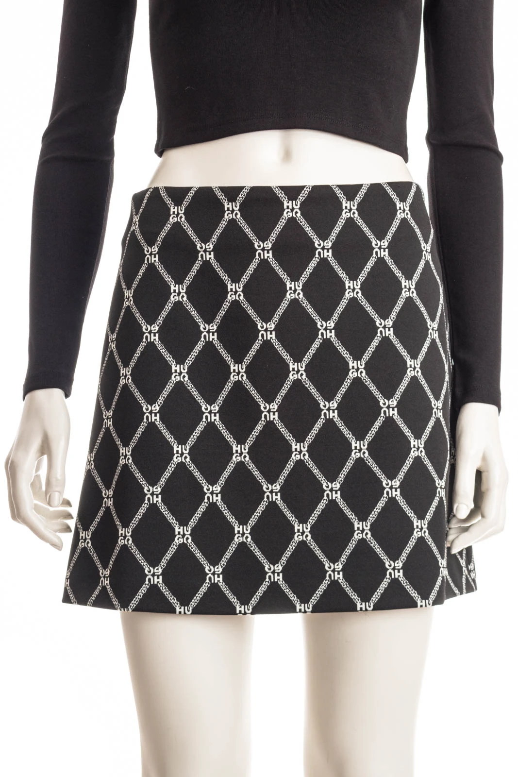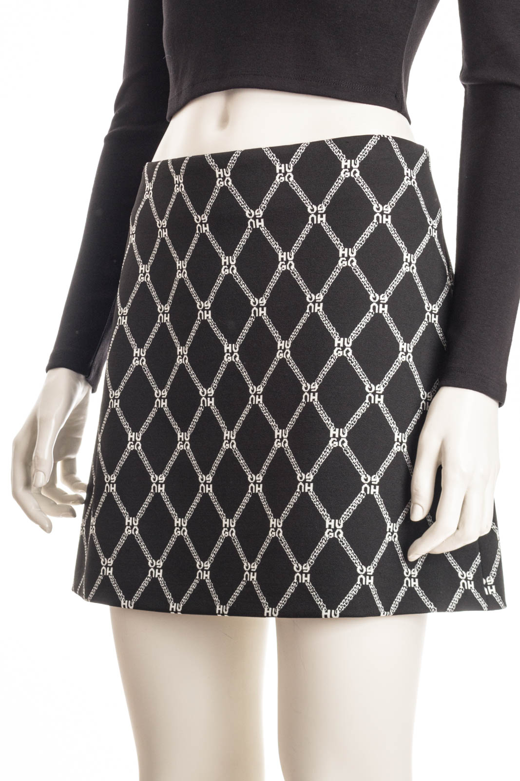 Minirock von Hugo mit Strack-Logo-Muster. Passend dazu der Blazer ALMINA Art. 50517954 001 und die Hose HEDIMA Art. 50519151 977.