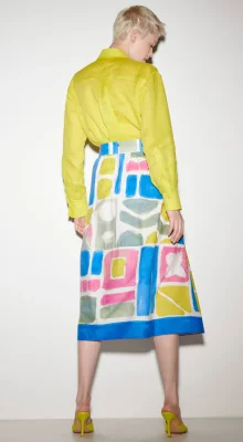 Ausgestellter Midirock aus reiner Baumwolle mit exklusivem grafischem Print in sommerlicher Farbigkeit. Der Rock besitzt zwei Seitentaschen und ist auf der Rückseite mit einem Reißverschluss ausgestattet.