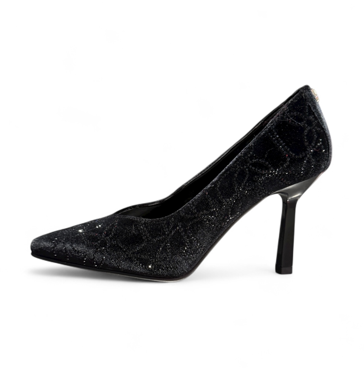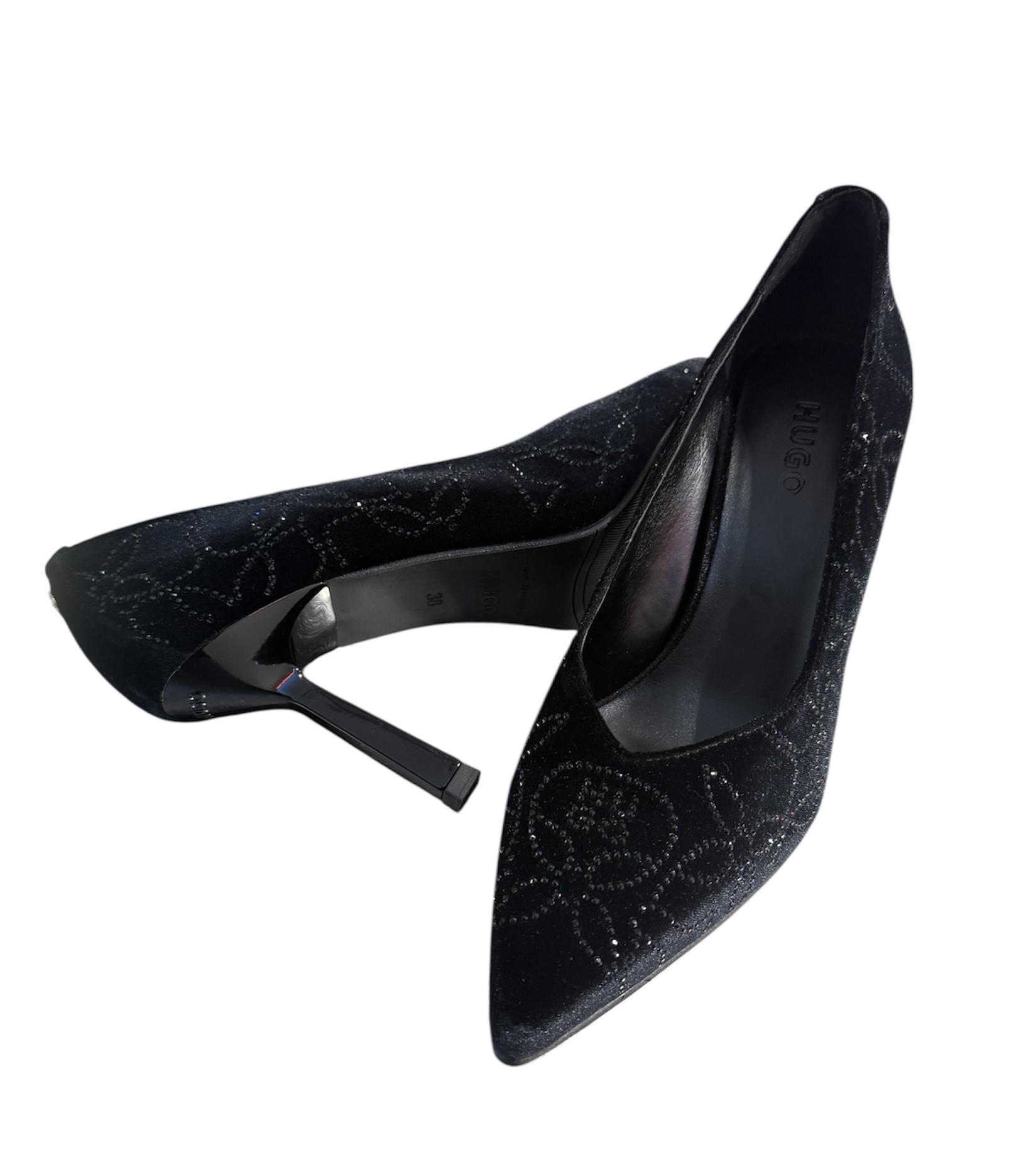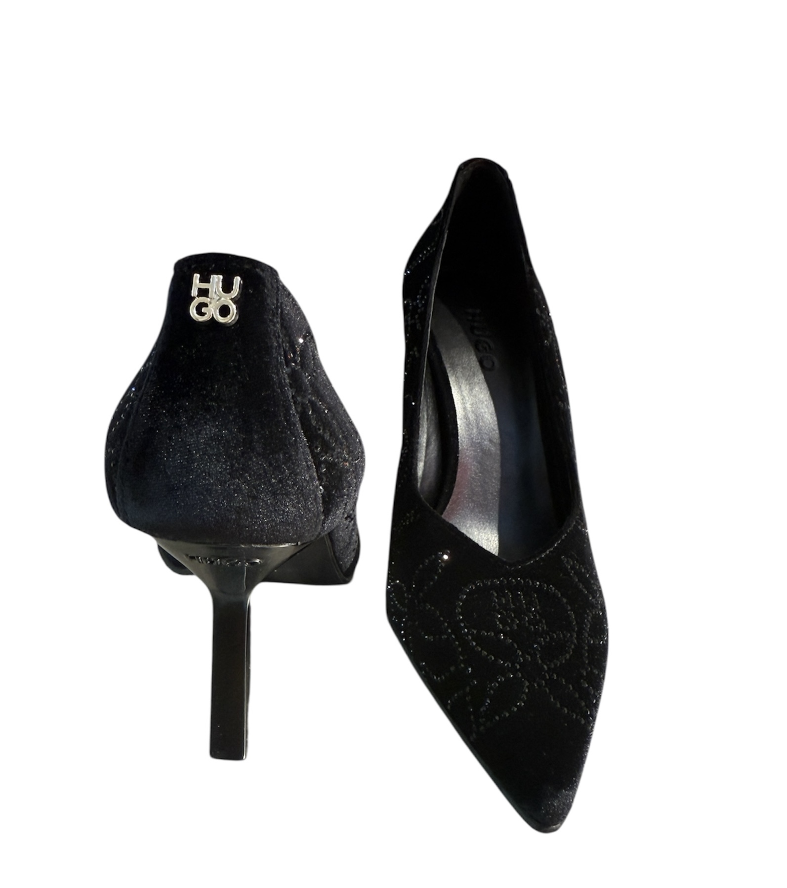 Die HUGO Pumps aus edlem Samt sind mit funkelnden Strasssteinen versehen und eine ideale Wahl fĂĽr den Abend. Komfortable Polsterung. 9,0 Zentimeter hoher Absatz und spitze Kappe.