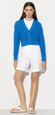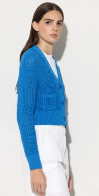 Kurzer Cardigan in Rippstrick-Qualität mit V-Ausschnitt und Knopfleiste. Auf der Vorderseite sind zwei kleine Taschen aufgesetzt.