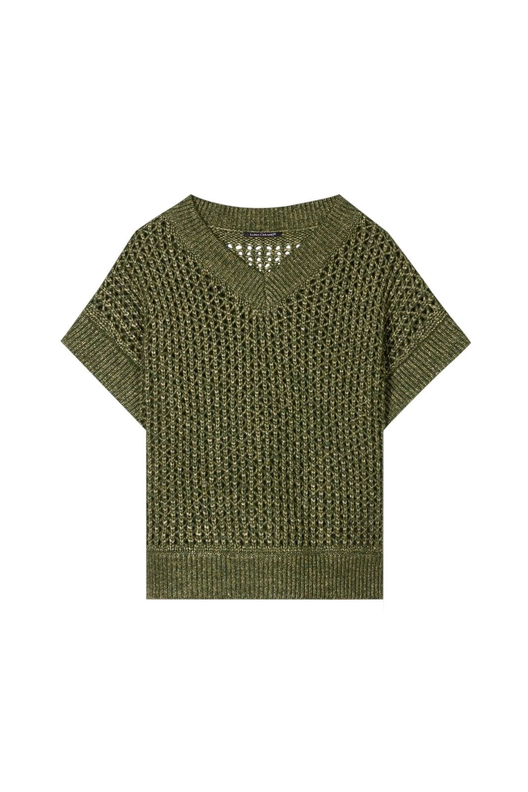 Pullunder mit Lochstruktur aus sommerlichem Tape-Garn mit Papery-Touch. Durch die überschnittenen Schultern und eingearbeiteten Glanzgarn wirkt der Pullunder lässig und glamourös zugleich.