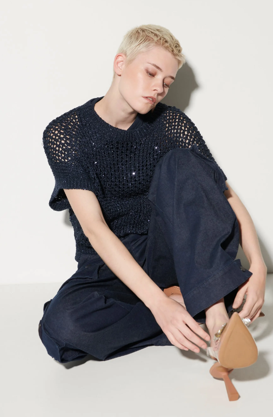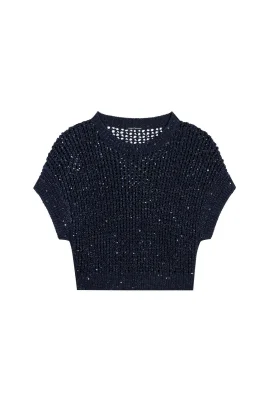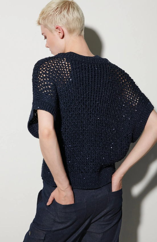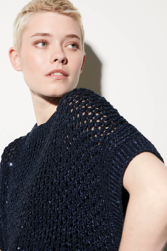 Pullunder mit Lochstruktur aus sommerlichem Tape-Garn mit Papery-Touch. Durch die überschnittenen Schultern und eingearbeiteten Pailletten wirkt der Pullunder lässig und glamourös zugleich.