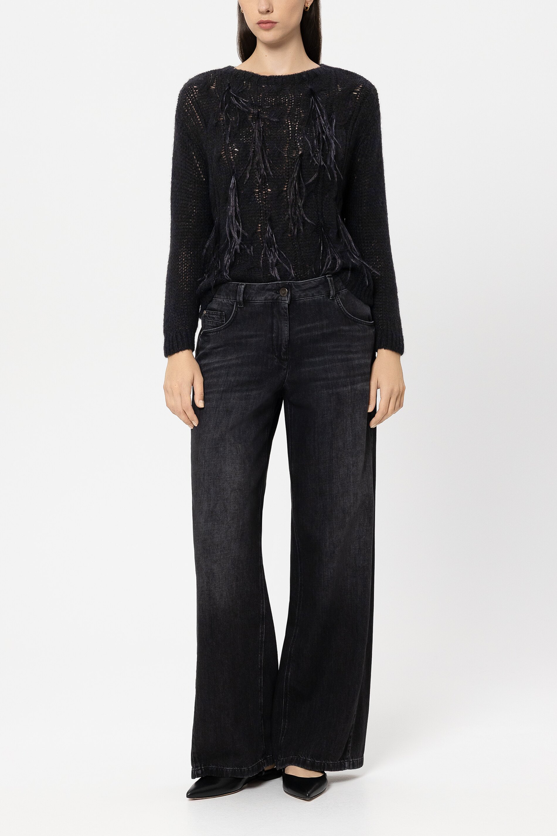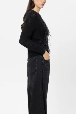 Strickpullover aus besonders weicher Alpaka-Woll-Mischung in luftig-leichter Airspun-Verarbeitung mit Zopfmuster und Rundhalsausschnitt. FĂĽr echte Wow-Effekte sorgen die in Handarbeit applizierten Federn.