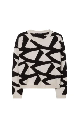 Pullover in verkürzter Passform mit geripptem Rundhalsausschnitt und Rippbündchen an Ärmelabschlüssen und Saum. In das leichte, verstrickte Baumwollgarn wurden große Intarsia-Grafiken eingearbeitet.