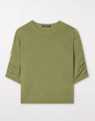Strickpullover aus edlem Kaschmir-Mix für ein besonders weiches und angenehmes Tragegefühl. Der körpernah geschnittene Pullover hat einen Rundhalsausschnitt, halblange Ärmel mit dezenten Raffdetails sowie gerippte Bündchen an Kragen, Saum und Ärmeln.