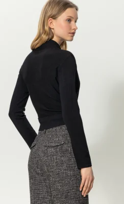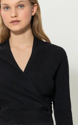 Schmal geschnittener Pullover in angesagtem Cropped-Design. Der Pullover wurde aus weichem, fein gestricktem Viskose-Stretch gefertigt und besitzt einen tiefen V-Ausschnitt mit Wickel-Optik.