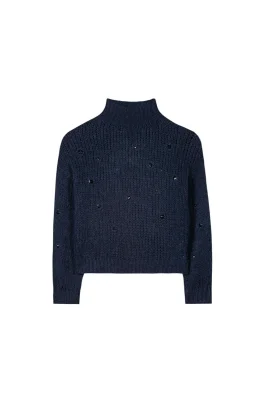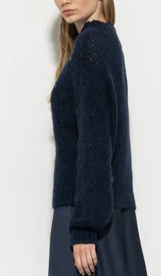 Strickpullover aus sehr leichter Woll-Alpaka-Mischung in legerer, leicht verkürzter Passform mit überschnittenen Schultern und angeschnittenem Kragen. Die großen, aufgenähten Glitzersteine mit Handstich-Details setzen einen glamourösen Akzent, verfügbar in Farbe light grey melange und midnight blue.
