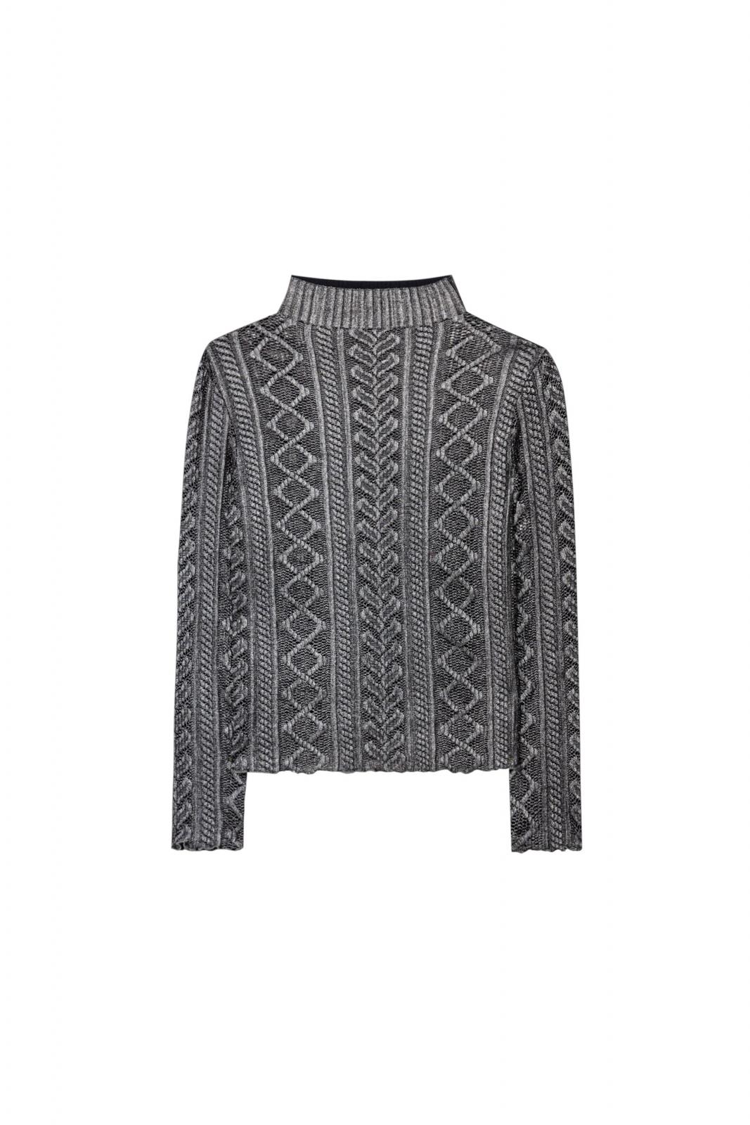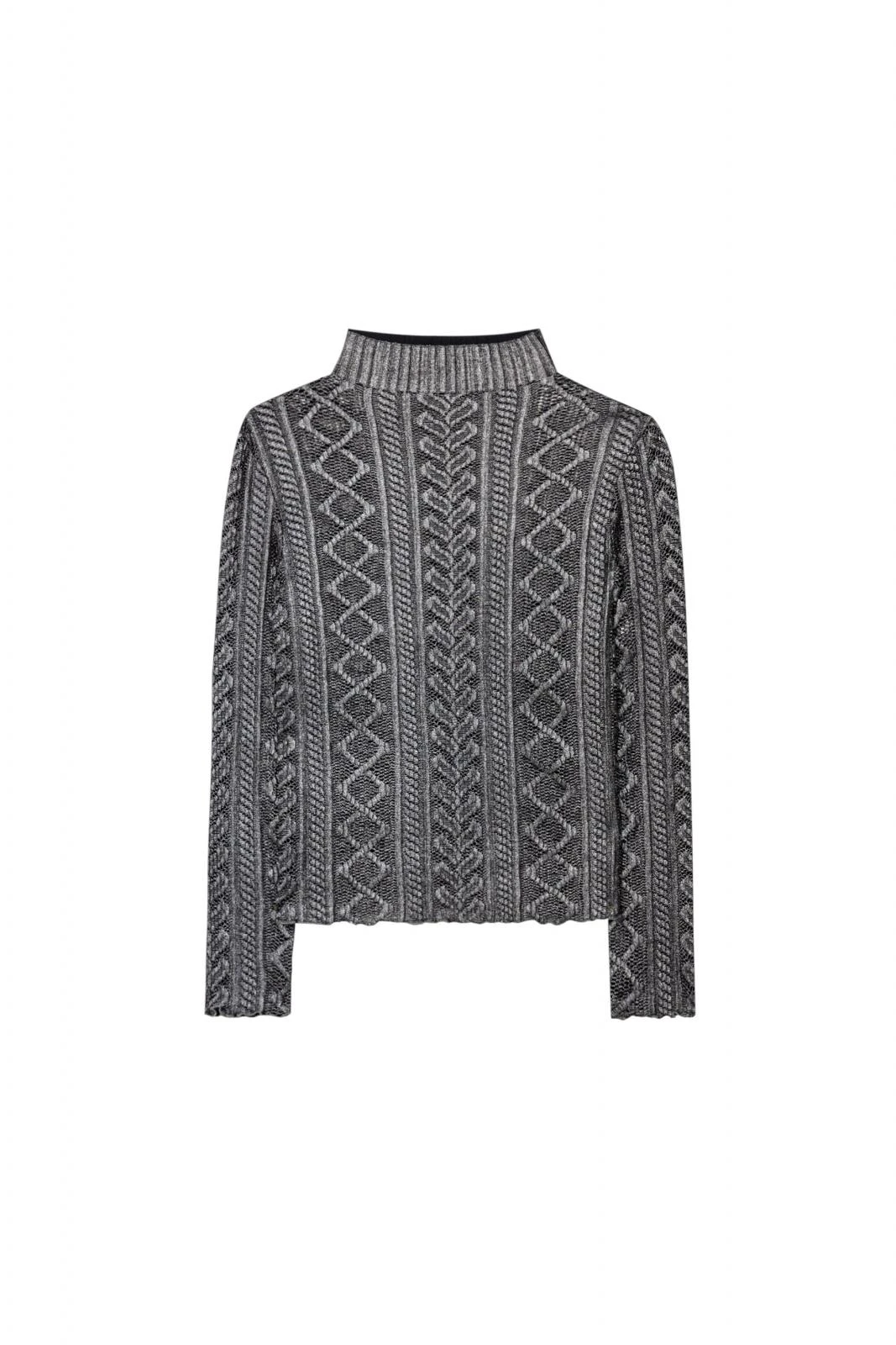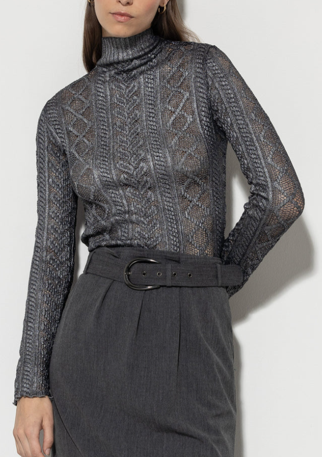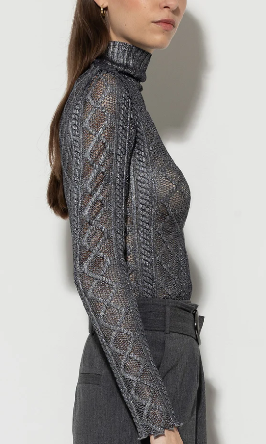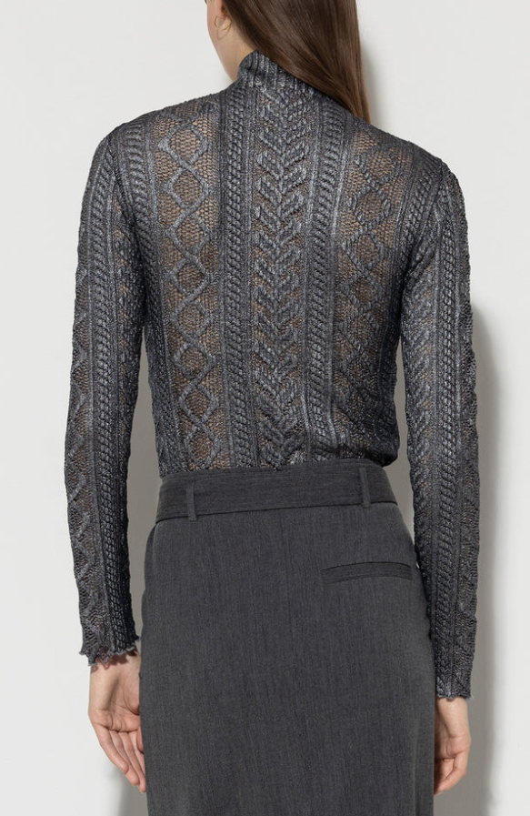 Langarmshirt aus elastischer Spitze mit einer Beschichtung aus glänzender Metallic-Folie. Der angeschnittene Kragen und der gekräuselte Rollsaum runden den Look ab.