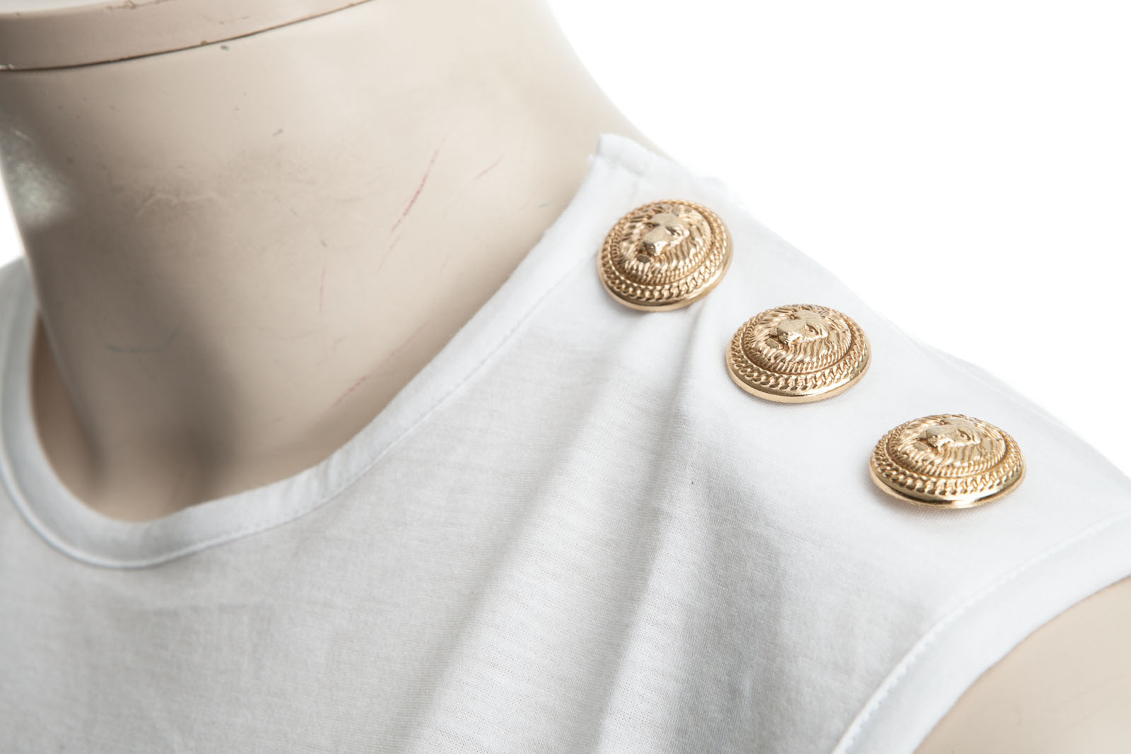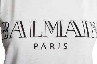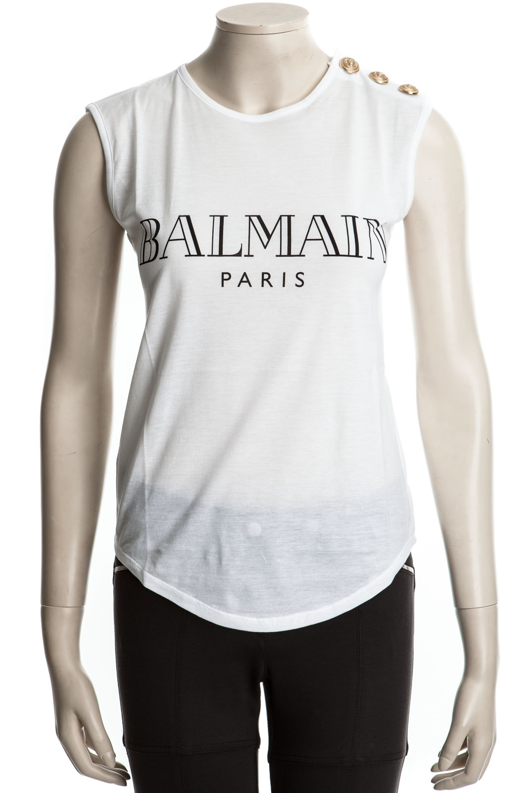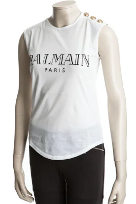 Exclusives Top mit goldfarbenden Knöpfen an der Schulter und BALMAIN-Druck auf der Vorderseite.