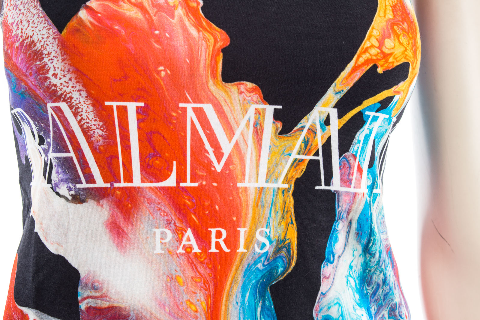 Farbiges Top mit dem typischen goldfarbenden BALMAIN-Schriftzug auf der Brust.