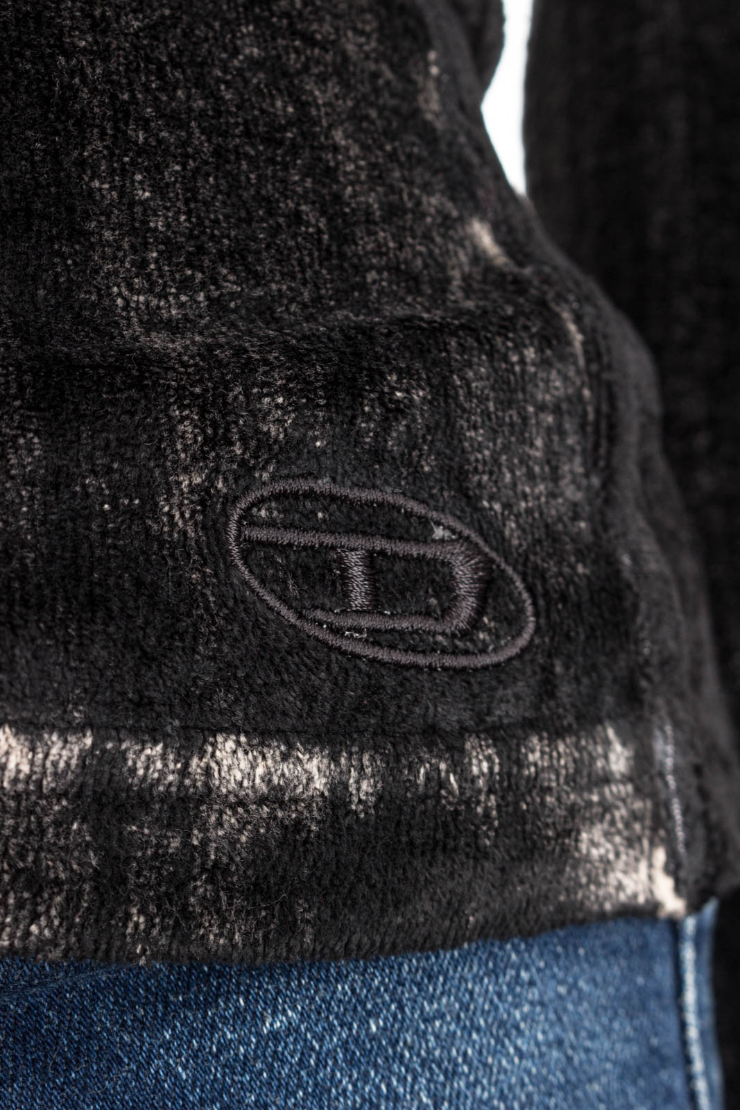 Pullover für Damen mit Stehkragen aus plüschiger Chenille. Dieses schwarze Modell in körpernahem Fit wurde von Hand mit vertikalen Pinselstrichen verblasst und mit Trompe-l'Œil-Stofffalten versehen. Die Seiten und Ärmel sind unbehandelt und bilden klobige, farblich abgestimmte Bänder. Eine Oval D-Stickerei am Saum komplettiert das Modell.