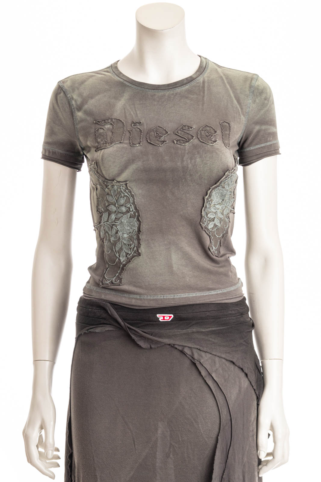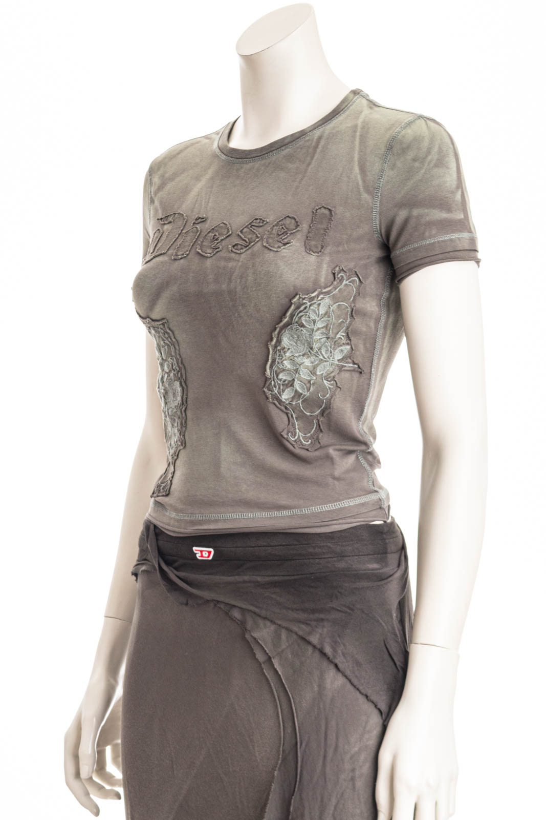Dieses T-Shirt für Damen in schmalem Fit aus Stretch-Baumwolle ist mit aufgestickten Blumenpatches und einem Diesel-Schriftzug im Gothic-Stil versehen. Das mit kontrastierenden Überstichnähten versehene Kleidungsstück wurde behandelt und gefärbt, um einen vielgetragenen, fleckigen Effekt zu erzielen.