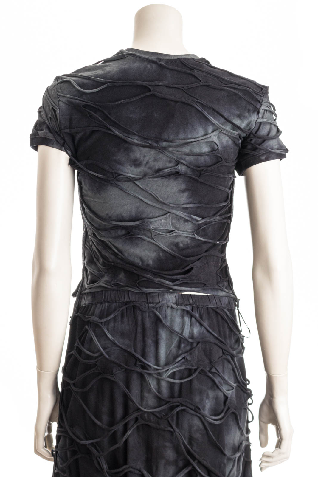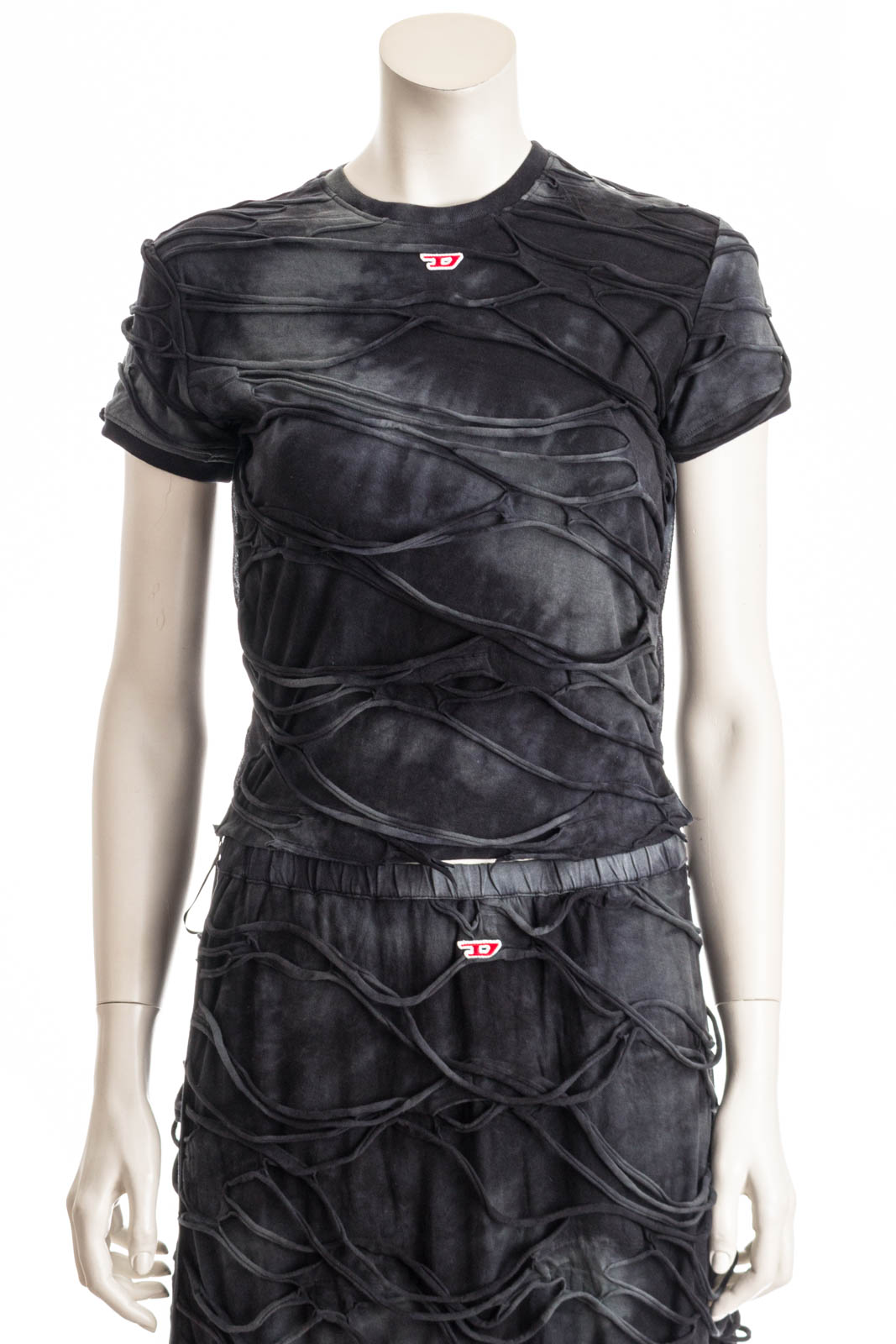 T-Shirt für Damen in schmalem Fit aus Baumwolljersey mit Batik-Finish. Ein Netz aus offenkantigen Fäden überzieht das Top aus farblich abgestimmtem Stoff, um einen schwebenden Effekt zu erzeugen. Eine kleine D-Stickerei auf der Brust rundet das Modell ab.