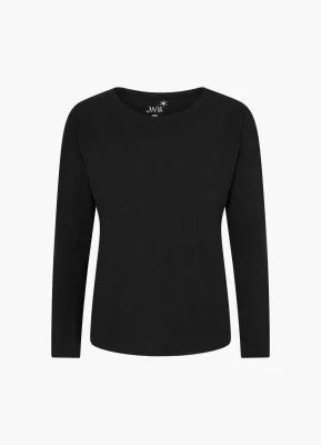 Als Basic Piece fĂĽr variable Loungewear-Looks erweist sich das schwarze Longsleeve mit ĂĽberschnittenen Schultern.
