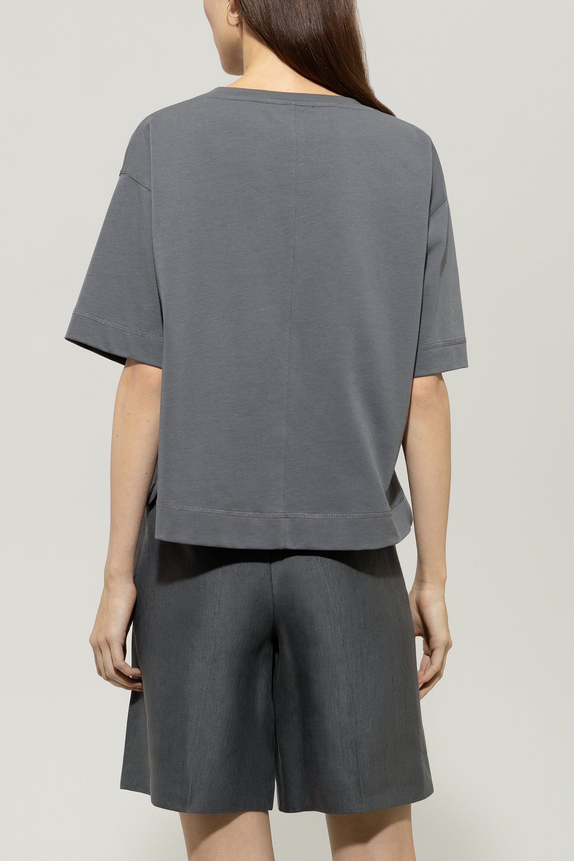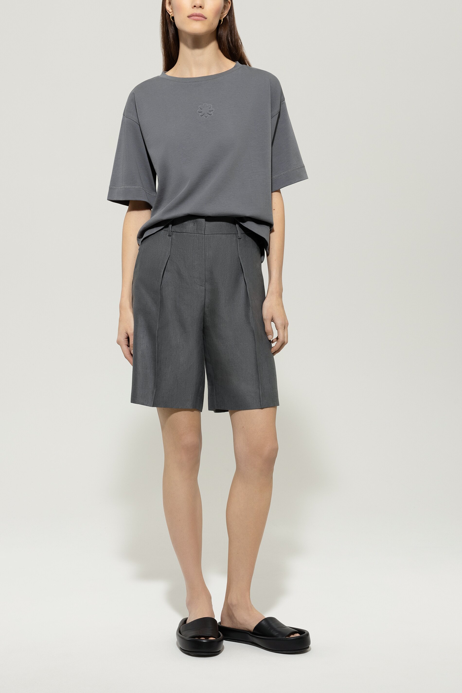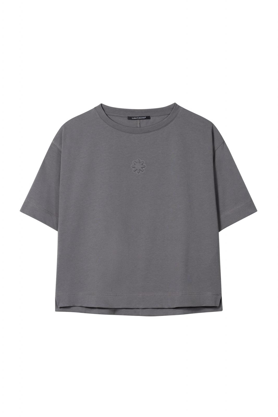 Leger geschnittenes T-Shirt aus nachhaltigem Baumwoll-Jersey mit Rundhalsausschnitt, überschnittenen Schultern und geprägtem Blumen-Detail. Der Saum ist mit kurzen Seitenschlitzen versehen.